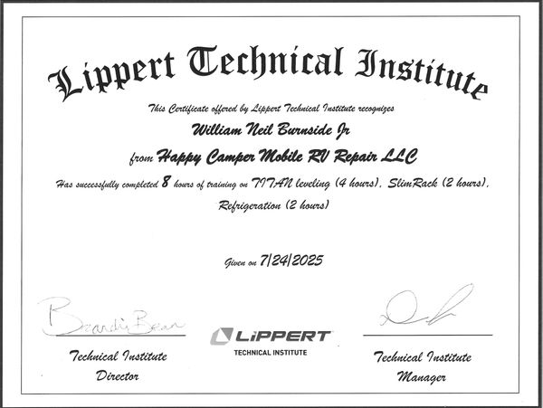 Neil's Lippert certification for Schwintek Slide Out System & Furrion A/C